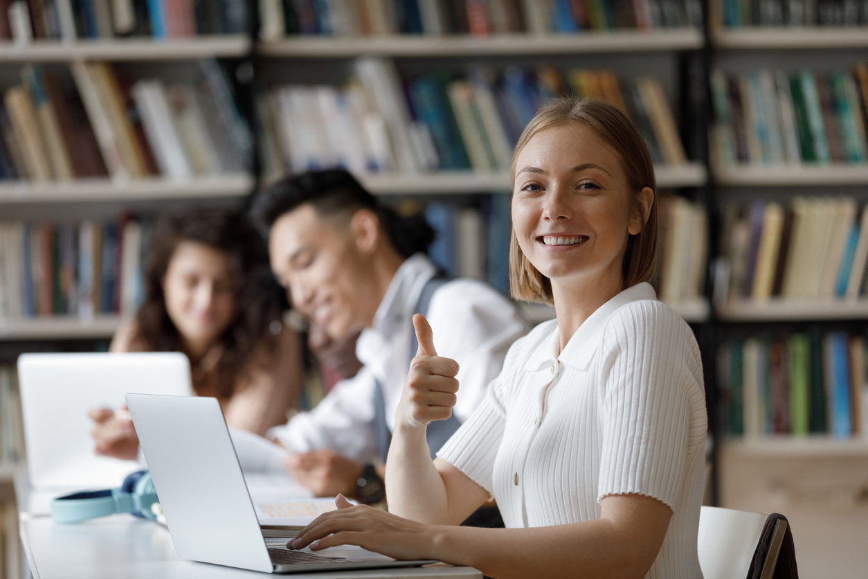 Student girl sit at table with laptop look at camera showing thumbs up, group of schoolmates on background. Higher education institution pupil portrait, e-learning, preparing for exam use tech concept