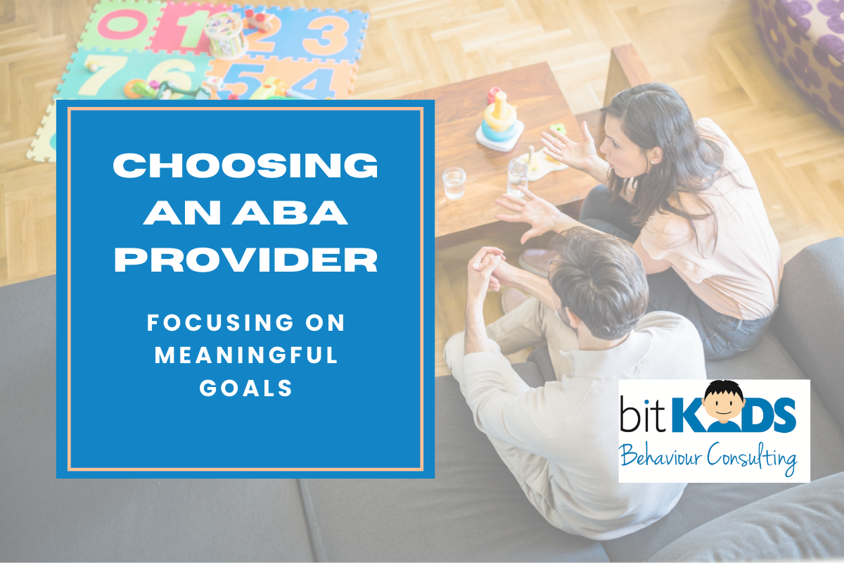Title Choosing and ABA Provider – Focusing on Meaningful Goals in bold, white lettering in a blue box. Transparent background photo of a family sitting and talking around a coffee table and toys.