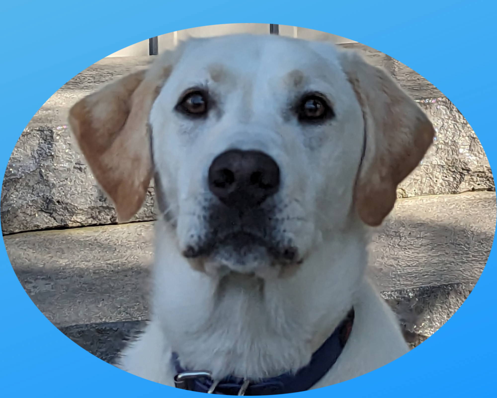 Headshot of a white dog with a blue border.