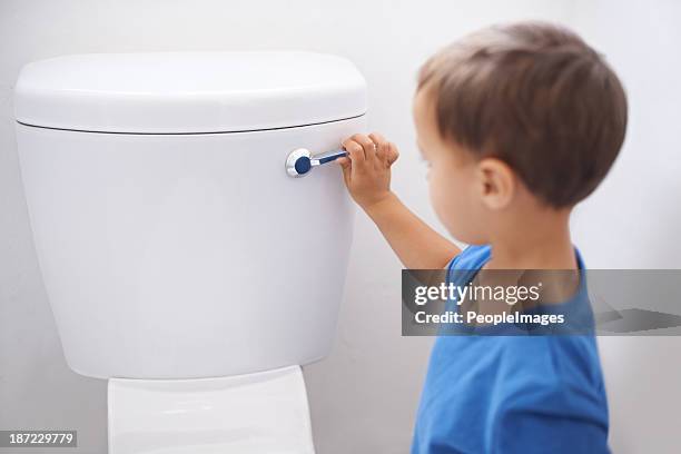 Shot of a cute young boy flushing a toilet